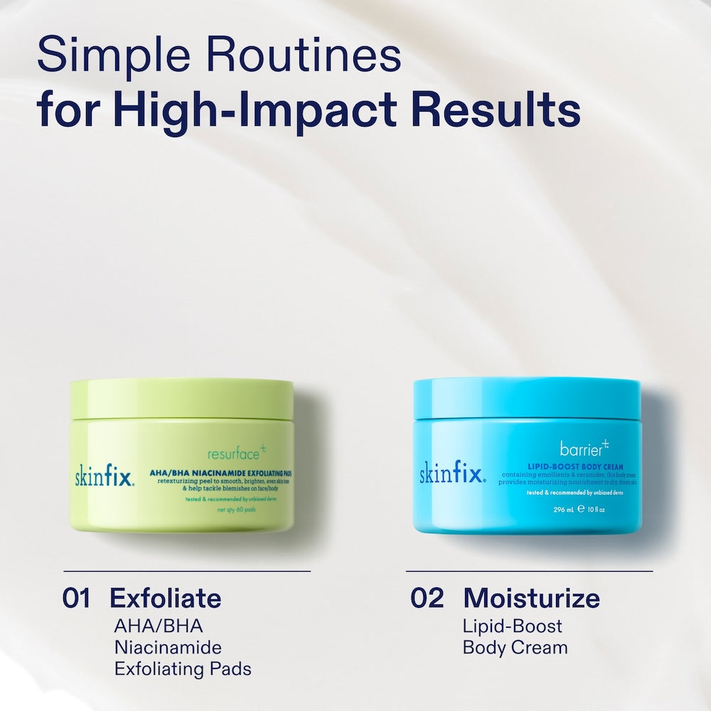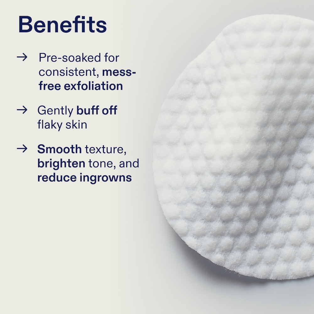 - These easy-to-use, gently textured pads deliver a potent trio of exfoliating acids—which help smooth rough texture, clear away flakes and dead skin cells that trap ingrown hairs, and visibly reduce discoloration all over your body.